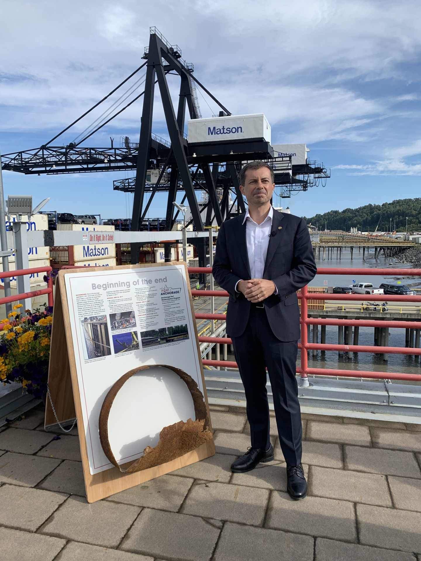 Former Transportation Secretary Pete Buttigieg and his staff did a lot of the advance work on the program, which got an initial $68.7 million grant. Buttigieg was in Anchorage in 2023 to tour the facility and see firsthand the corrosion and seismic risks faced by the port, which handles 90 percent of the state's essential goods.