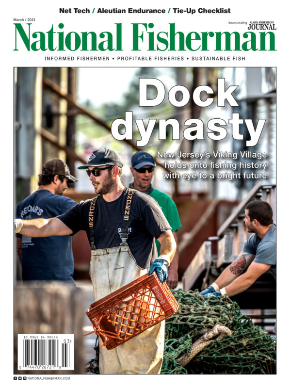 Cover Story: New Jersey’s Viking Village approaches its second century with a promising future in the iconic fishing hamlet of Barnegat Light. • The ancient art of purse seining gets lighter, stronger nets, and digital sensors. • Boatbuilding: The “hot rod” Aleutian Endurance heads north for her first season. • Updated federal health guidelines say children should be eating more fish — as early as 6 months old. • Around the Yards: New clam boat may inspire more; chicken house turned boatshop; convertible bow-and-stern picker. • Product Roundup: Furuno’s new high-res, split-beam sounder; Grundéns introduces its Weather-Boss clothing lineup; C-Map navigation warning system. and more!