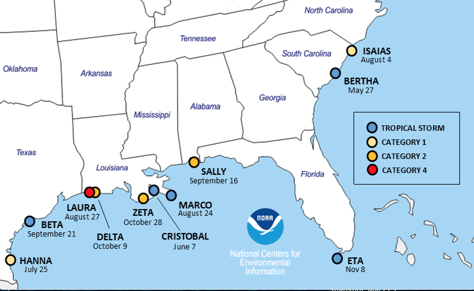 Nicaragua was slammed by two late season category 4 storms, Eta and Iota, that struck with two weeks, their landfalling tracks 25 kilometers (15.5 miles) apart. Twelve tropical systems made landfall in the continental U.S., breaking the previous record of nine landfalls set in 1916, the report notes.