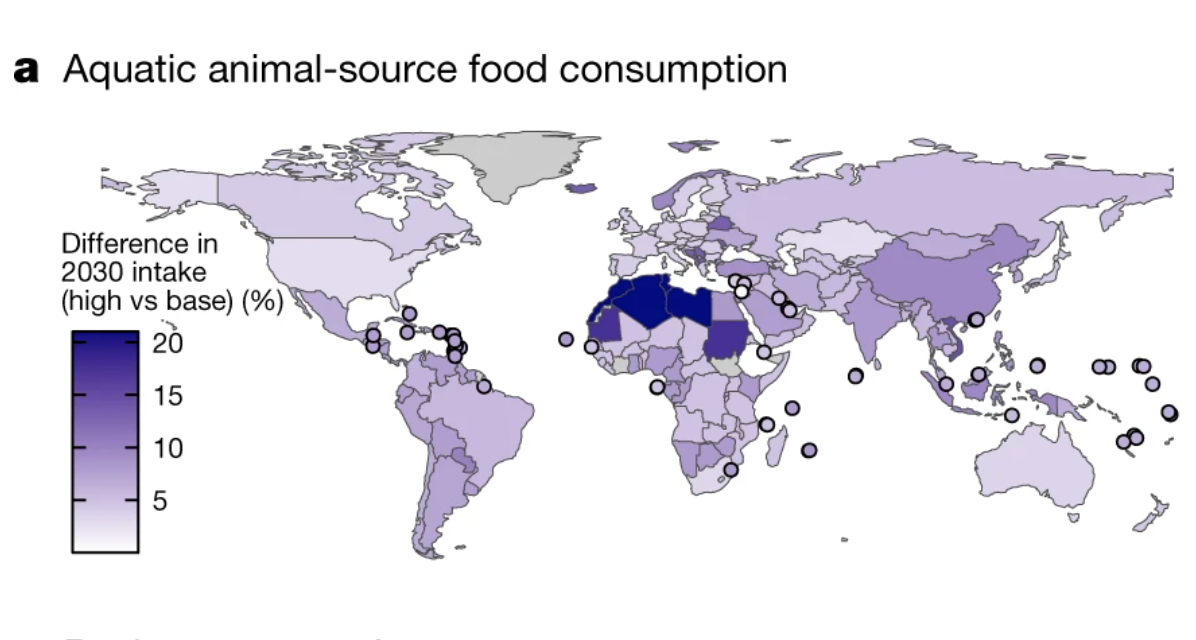 That roughly 8 percent increase in production of wild-caught fisheries and aquaculture – the latter including familiar species of shrimp and shellfish and also seaweed, plants and species like sea cucumber – would also prevent about 166 million cases of “inadequate micronutrient intake” especially in malnourished children by expanding those food choices, the study says.