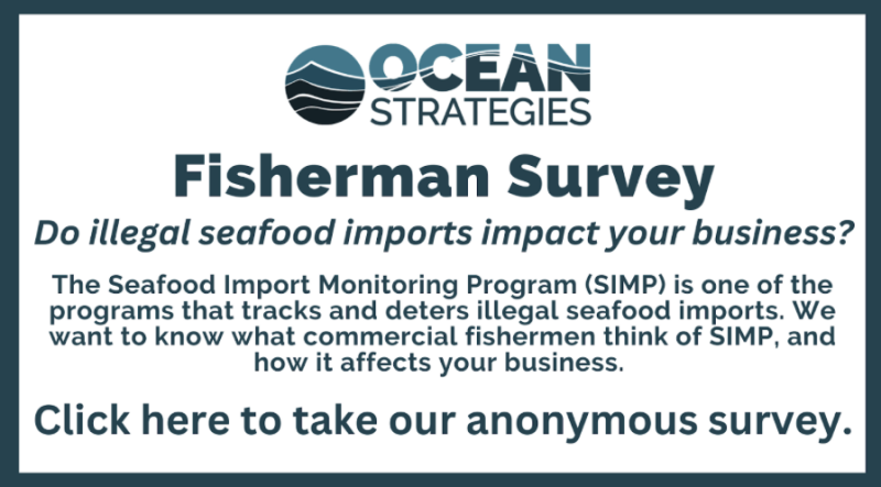 “Currently, SIMP monitors 13 seafood groups that are imported into the United States. SIMP is designed to prevent illegal and unregulated seafood from entering the U.S. market,” according to the Ocean Strategies survey. “Now that the program has a few years under its belt, NOAA is considering expanding the species that are monitored under this program. They are seeking feedback from commercial fishermen on the current and proposed programs.”