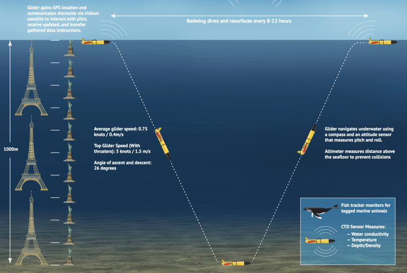 On their wings, autonomous gliders ‘fly’ under the sea surface, moving at very low speed with only a small thruster propeller, mostly using ballast water and tiny pumps to adjust their buoyancy and glide in zig-zag paths through the water column, while onboard sensors record data.