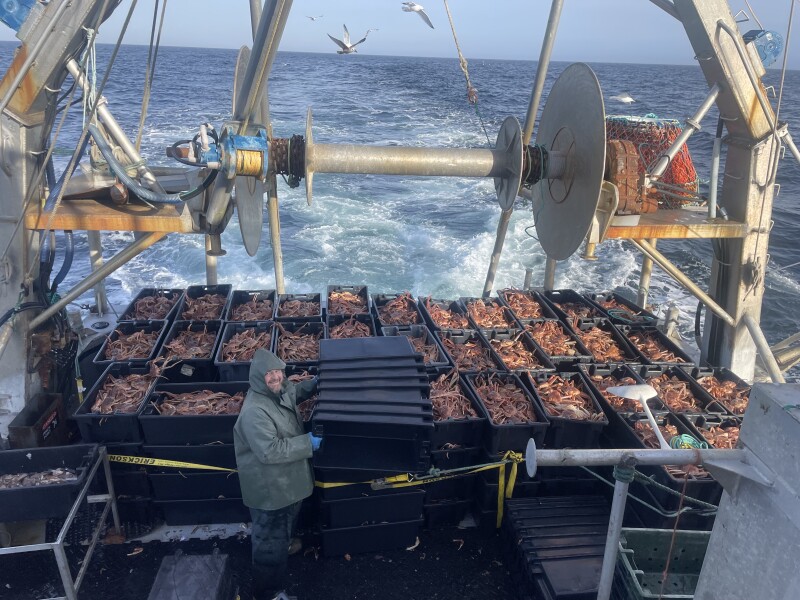 Captain John Efford Jr., with his boat, the Four Jacks, out of Port de Grace, Newfoundland, bringing home 46,000 pounds of snow crab after a two-day trip. “There’s 10,000 pounds on deck, and the hold is full too.” Photo by John Efford Jr.
