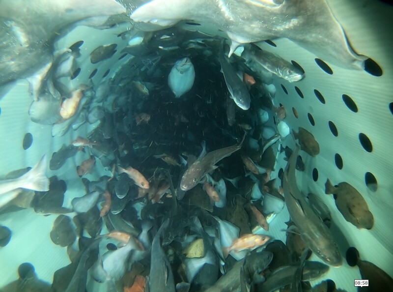 The closed cod end on the FloMo with its reduced flow allows fish to swim naturally rather than being exhausted and crushed in a standard cod end. Holes in the retention modules (extension) can be adjusted to allow bycatch to escape. FloMo photo.