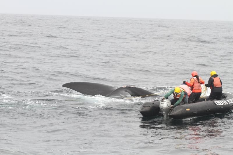 Trained responders use a grapple to grab an entanglement trailing behind a North Atlantic right whale in Northeast waters. Center for Coastal Studies photo/NOAA Permit # 24359.