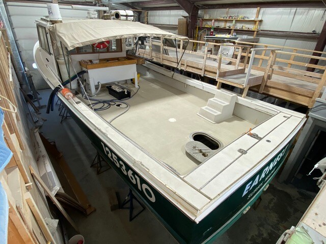 The Mariah Eve’s deck was torn out to add additional fish and fuel storage. The new deck is layered with ½-inch rubber. Up forward, bench seats are being added along with an enclosed head with a shower. “Instead of a strictly plain lobster boat, we are turning it into a tuna boat, so they can stay out overnight. There will be a green stick and icemaker and water maker,”
