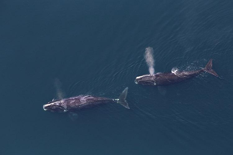 The New England Aquarium used systematic aerial surveys, and NEFSC and the Center for Coastal Studies directed surveys conducted in areas where right whales were present, to document aggregations of right whales. Aerial photographs of individual right whales to help estimate the whales’ abundance and residency times, and the photos identify individual whales by distinctive patches of raised tissue on their head, lips, and chin, and by scars on their body.