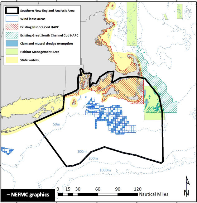 Concern over the impact of offshore wind energy development – and potentially aquaculture in federal waters – has the New England Fishery Management Council preparing a ‘Habitat Area of Particular Concern’ (HAPC) in southern New England to focus on cod, scallops and other species that rely on essential fish habitat south of Cape Cod.