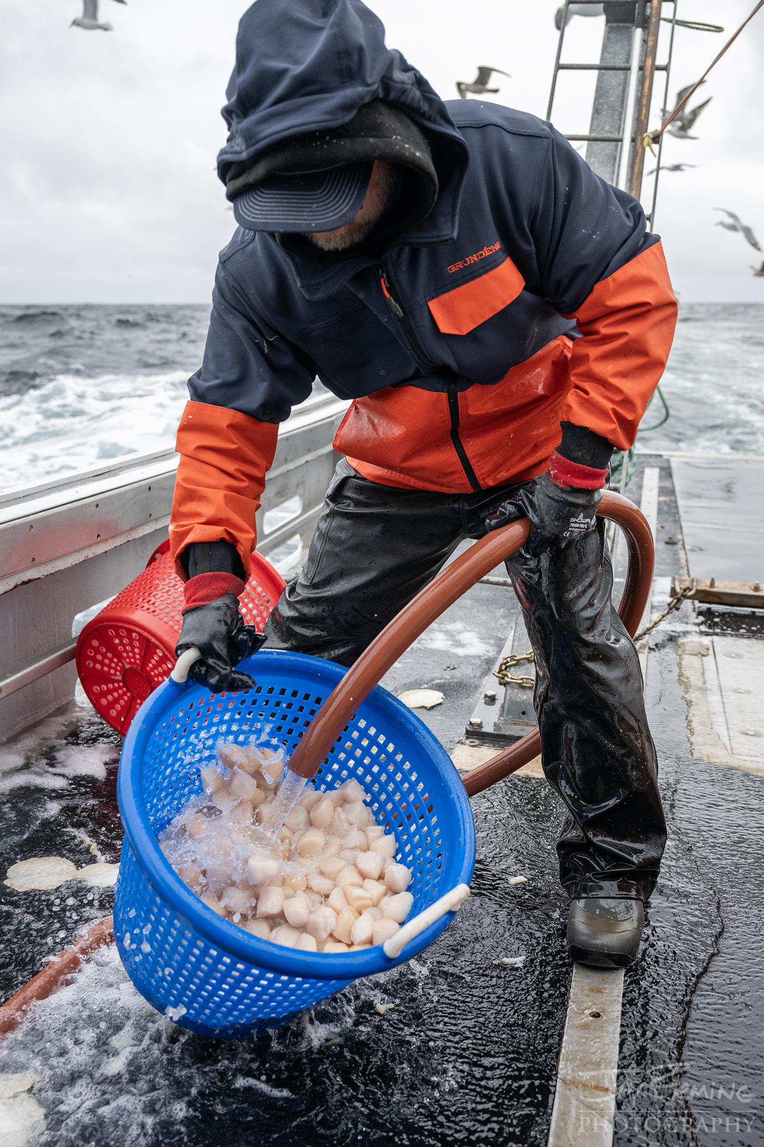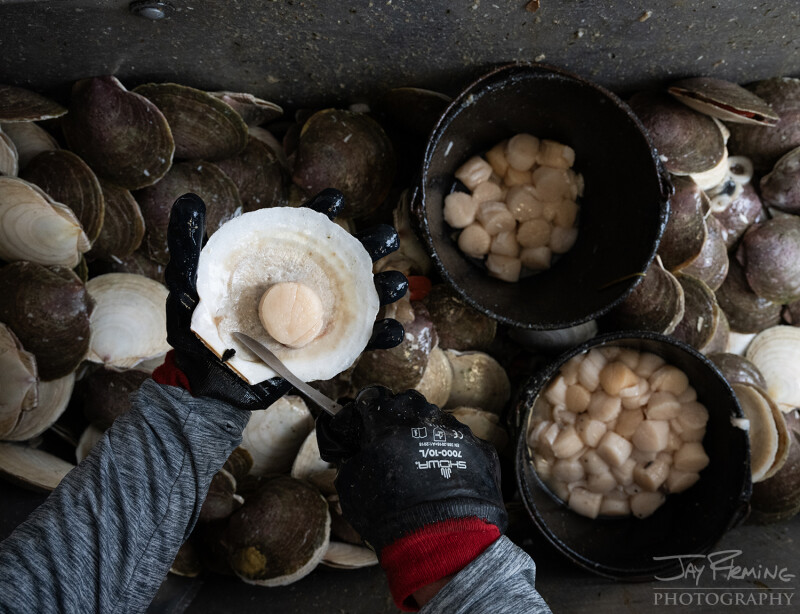 On the third day of the season, Lybarger had to make 6 tows to get his four buckets. “None of them more than 12 minutes,” he says. “We were in by 3 o’clock. But the scallops aren’t as thick as they were last year. On April 4, we made 9 tows, up to 25 minutes, and I heard some guys made 15.” But Lybarger notes the scallops are still good size and quality. “We’re getting U12s,” he says, referring to the scallops running less than 12 meats to the pound. “The price is down from last year, but it’s still $30 a pound. I’ll take that all day.”