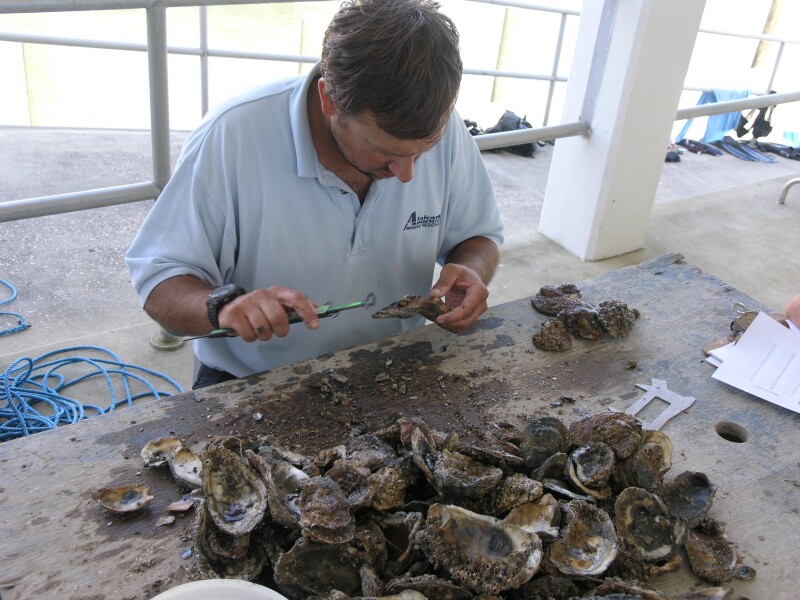 Alabama Marine Resources Division biologist Jason Herrmann, counts oysters, oyster drills, and cultch in a sample from one of the state’s reefs. The absence of spat is causing concern about the next couple of seasons. Alabama MRD photo.
