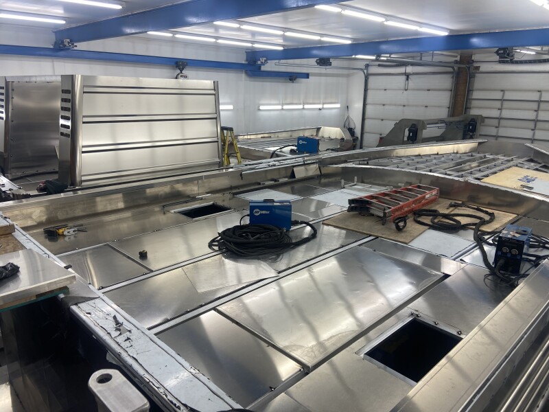 A pair of Bristol Bay gillnetters in the early stages of construction at Peregrine Boats. Both will have raised pilothouses mounted on stanchions like those shown on the one hull. Peregrine Boats photo