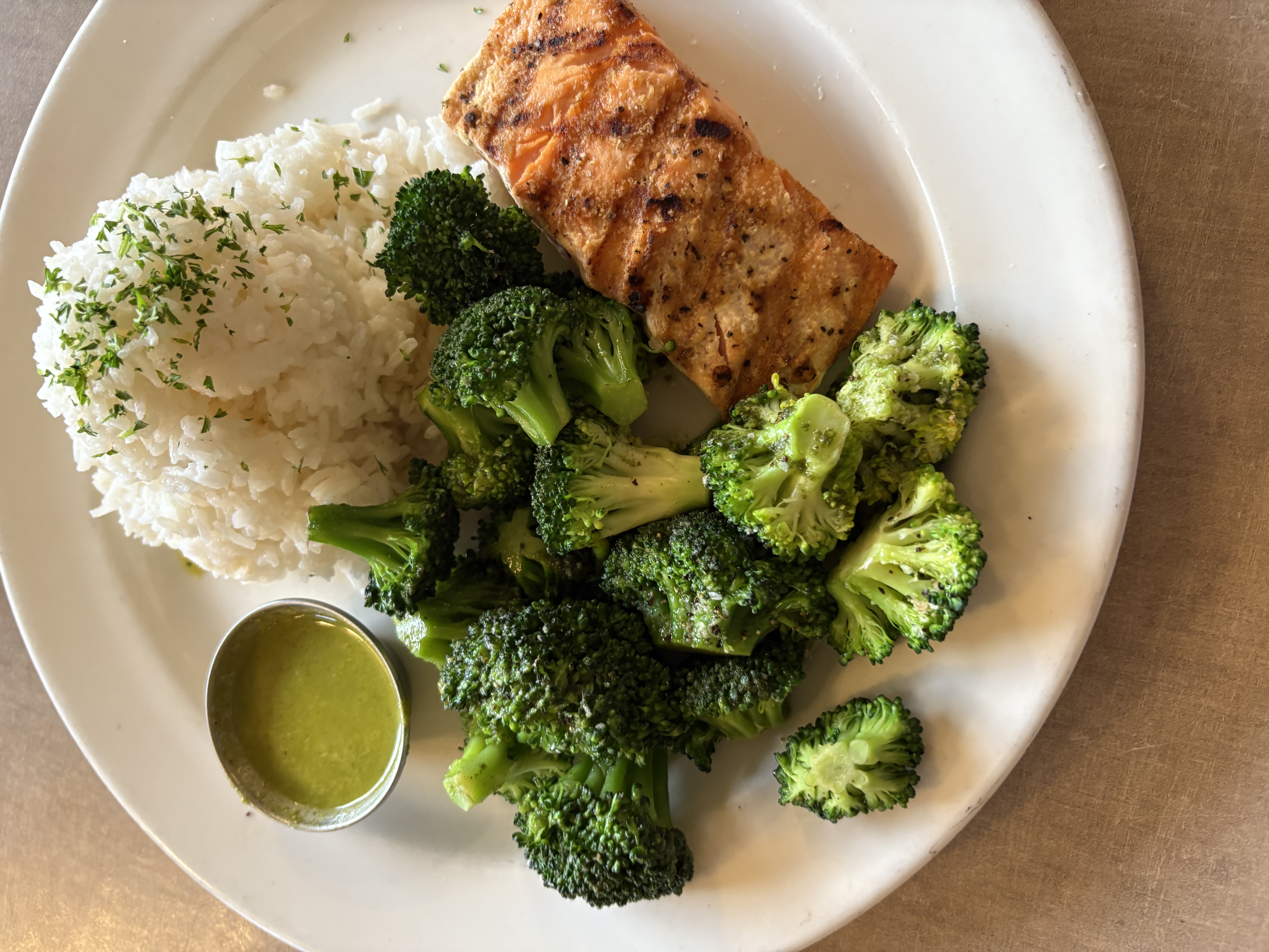 The salmon bowl, at $31, is a mix of warm Copper River sockeye salmon and jasmine coconut rice, with fresh avocado slices, and a spicy mango salsa.