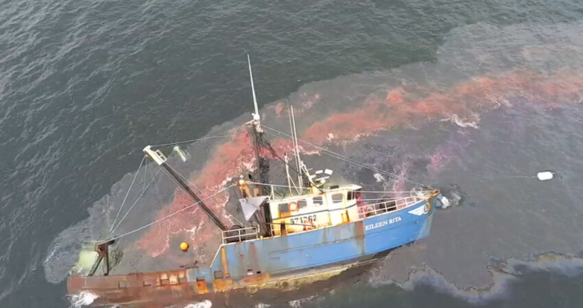 Photos released by the Coast Guard show the 86.1-foot Eileen Rita partially submerged, listing heavily to port, with an oily sheen visible on the surrounding water.
