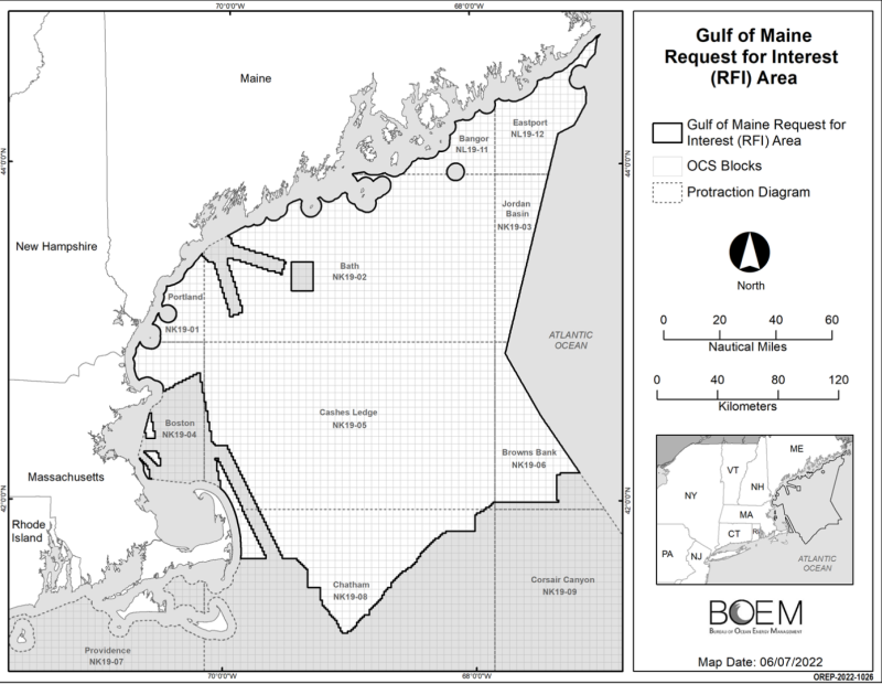 The Bureau of Offshore Energy Management will evaluate wind energy companies' interest in leasing across a 13.7 million-acre study area in the Gulf of Maine. BOEM graphic.