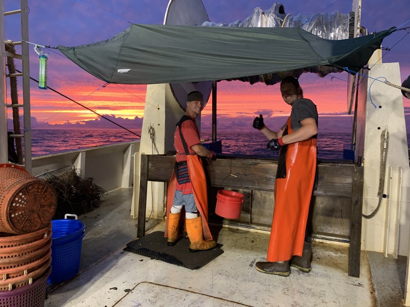 Jack Davis and Eric DeShields are scalloping with smiles on the F/V Elise G with Capt. Mike Cox on the Atlantic Open Bottom in July 2020.