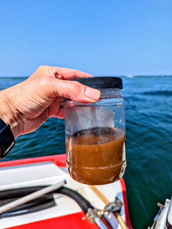 A nearshore Gulf of Maine water sample full of Tripos Muelleri collected in May 2023. Photo by Joe Vallino/Woods Hole Oceanographic Institution.