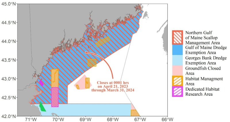 NMFS announced federal waters in the Northern Gulf of Maine scallop management area will be closed April 21 with the 2023 scallop quota set-aside being 100 percent caught. NMFS graphic.