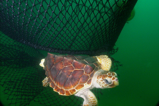 Loggerhead turtle escaping a net equipped with a turtle excluder device. NOAA photo.