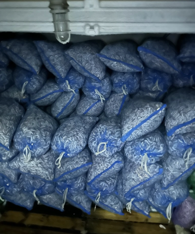 Illegally caught pink shrimp in the hold of a fishing vessel approximately 12 miles off Marquesas Keys, Florida, Sept. 19, 2024. Coast Guard photo/CPO Nicole Groll.