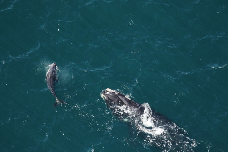 A right whale known to researchers as “Half Note” and her calf, sighted in January 2022 off of Georgia. The calf was thin with whale lice on its flukes, indications of poor health. Clearwater Marine Aquarium Research Institute photo/NOAA permit #20556