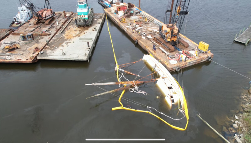 As Jonathan describes it, they were able to raise the 65-foot shrimp boat but couldn't get it to a safe place. "We got a couple of barges down there in October and lifted it with cranes, but the Coast Guard wouldn't let us take it across the channel at that time. It was too much weight for the cranes to hold it all night, so we had to set it down on bottom again. The next day, we tried lifting her again, but it was too much, and the straps tore right through her."