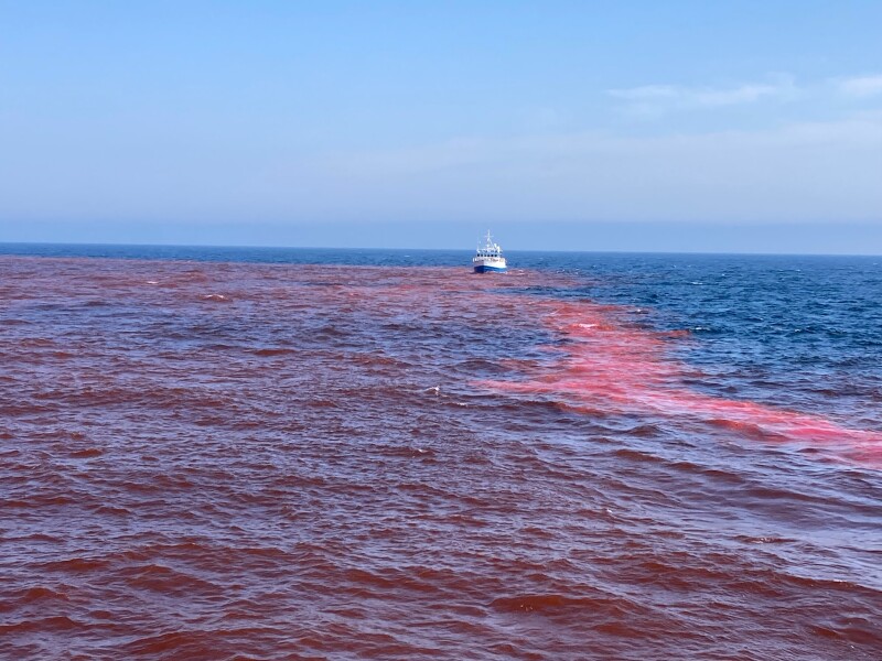 The research vessel Connecticut trails behind the OSV Mahoney as both vessels circle the alkalinity-enhanced patch, dyed red with rhodamine tracer for visibility. Sarah Schumann photo.