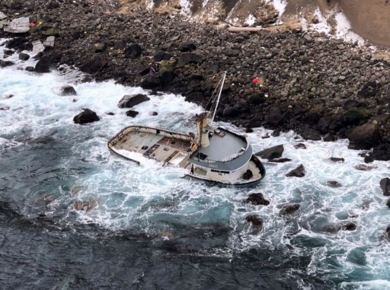 Attempts were made to free the Freyja from the rocks but to no avail. Breaking waves between 7 and 20 feet were hitting the Freyja, making it impossible to launch the life raft. The Alaskan Pearl, a nearby fishing vessel, received a mayday call and showed up about 2:30 am. In teams of two the Freyja’s crew swam to the Alaskan Pearl. The 40-year-old Freyja was salvaged that summer but was considered a total loss.
