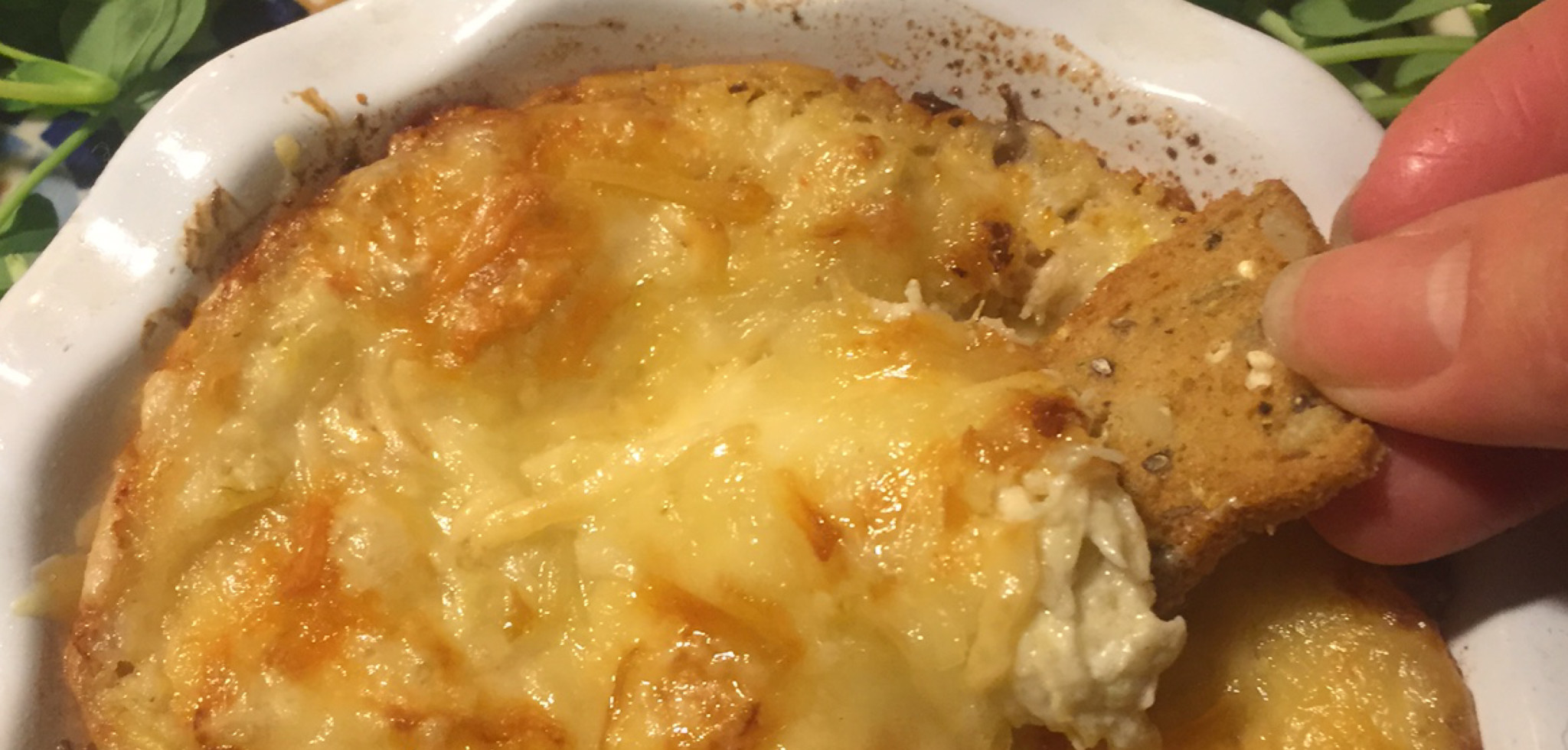 Season to taste and spread into several small oven-proof containers or one 8-inch skillet or baking dish. Bake until bubbly and golden on top, about 20 minutes. Serve with crostini or baked pita chips (instructions to follow).