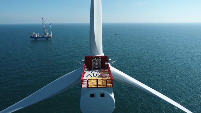 An installation vessel works on the second Coastal Virginia Offshore Wind pilot project wind turbine 27 miles off the coast of Virginia Beach. The pilot project became the first operational wind farm in U.S. federal waters in October 2020. Lyfted Media for Dominion