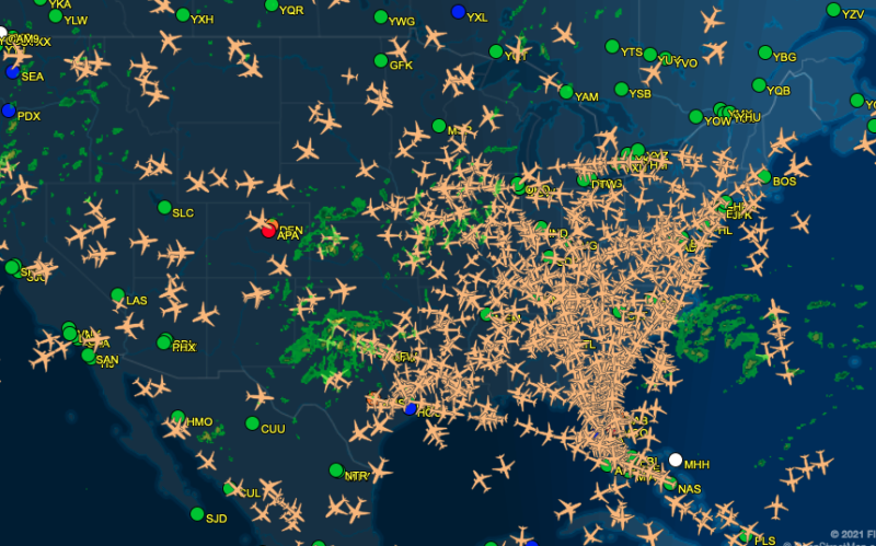 A FlightAware screenshot shows global air traffic over the United States at 7:30 a.m. EST. It will fill out over the western states as the day unfolds.