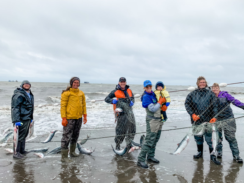 Crew Shots: Alex Johnson, Kitty Tolman, Sean Braman, Niki Riga, Christopher Riga, Nolan Braman and Tammy Braman, the 2020 setnet crew at pickup in Coffee Point, Bristol Bay. Photo by Garret “Otto” Means