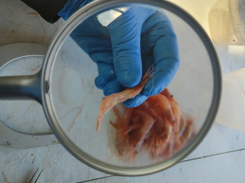 Washington Department of Fish and Wildlife coastal shellfish team member samples pink shrimp to determine size, sex, and age. Photo courtesy of WDFW