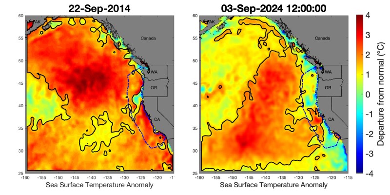 Imagery from NOAA's “Blobtracker” shows the intensity of the 2014-16 Pacific sea temperatures, compared to 2024 which also saw record sea surface temperatures in some areas of the Pacific, as did the 2025 blob. NOAA graphic.