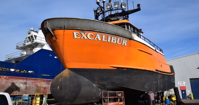 Hailing from Newport, Ore., is the 60’ x 30’ Excalibur that was in “to correct an issue from a sponson 10 years ago,” said Blake. The bow bulwarks needed to be raised 26 inches “to improve water deflection,” he said. Previously the bulwarks were “only about shin high with a handrail.” Other work on the Excalibur included plating renewal in the freshwater tanks and a stainless steel chafe guard on the mast’s aft face.