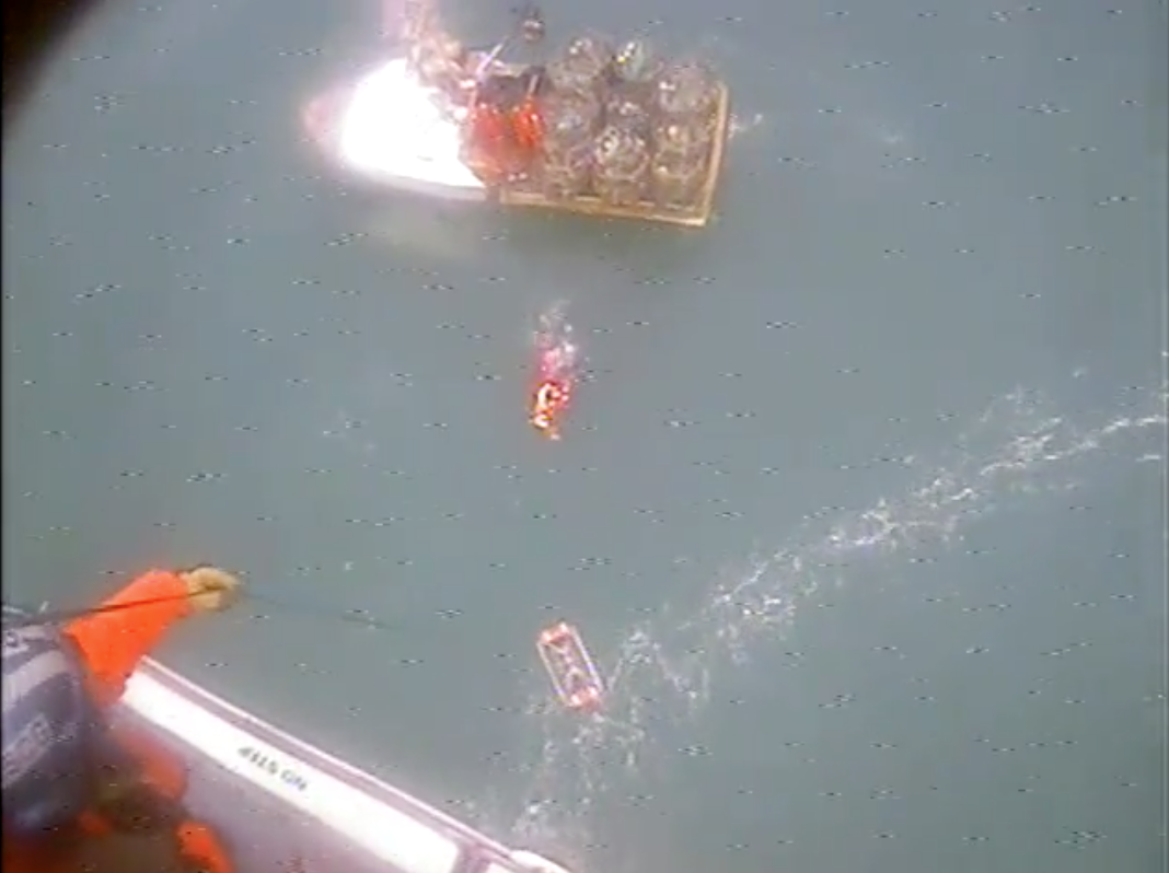 A rescue swimmer launched from the helicopter to help the crew evacuate the vessel in distress. All three crew members were hoisted safely to the helicopter and brought to shore with no reported injuries.