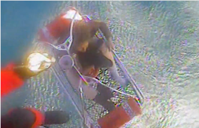 The crew’s rescue swimmer entered the water by free-fall and began recovering the survivors, assisting them and their dog with hoists into the cabin helicopter. The last survivor was hoisted with the swimmer at 4:30 p.m.