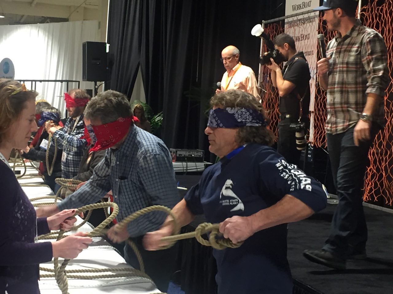 Emcees Jerry Fraser, publisher of National Fisherman, and Sean Dwyer, captain of the Bering Sea crabber Brenna A., led contestants through three heats, each measuring participants’ dexterity in key fishing skills: the ability to put a rim-racked net back together in a flash, quickly and accurately tie a series of knots while blindfolded (you never know when you’ll find yourself in a bind on a moonless night), and splice a line.