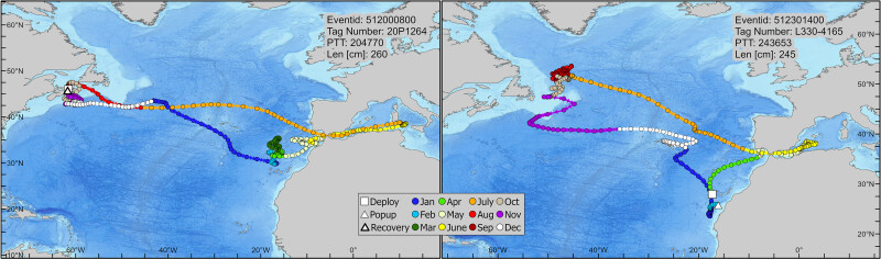 Electronic tag data confirmed what scientists had long suspected: bluefin tuna make extensive trans-Atlantic migrations, predominantly moving from east to west. Many fish originating in the eastern Atlantic and Mediterranean travel to U.S. and Canadian waters to feed and grow, often remaining in the west for several years before returning to spawn. Adult fish tagged in American and Canadian waters were found to migrate back to the Mediterranean to spawn, then return the following year to forage along the U.S. East Coast. Western-origin fish, by contrast, tended to remain west of the 45°W management boundary.